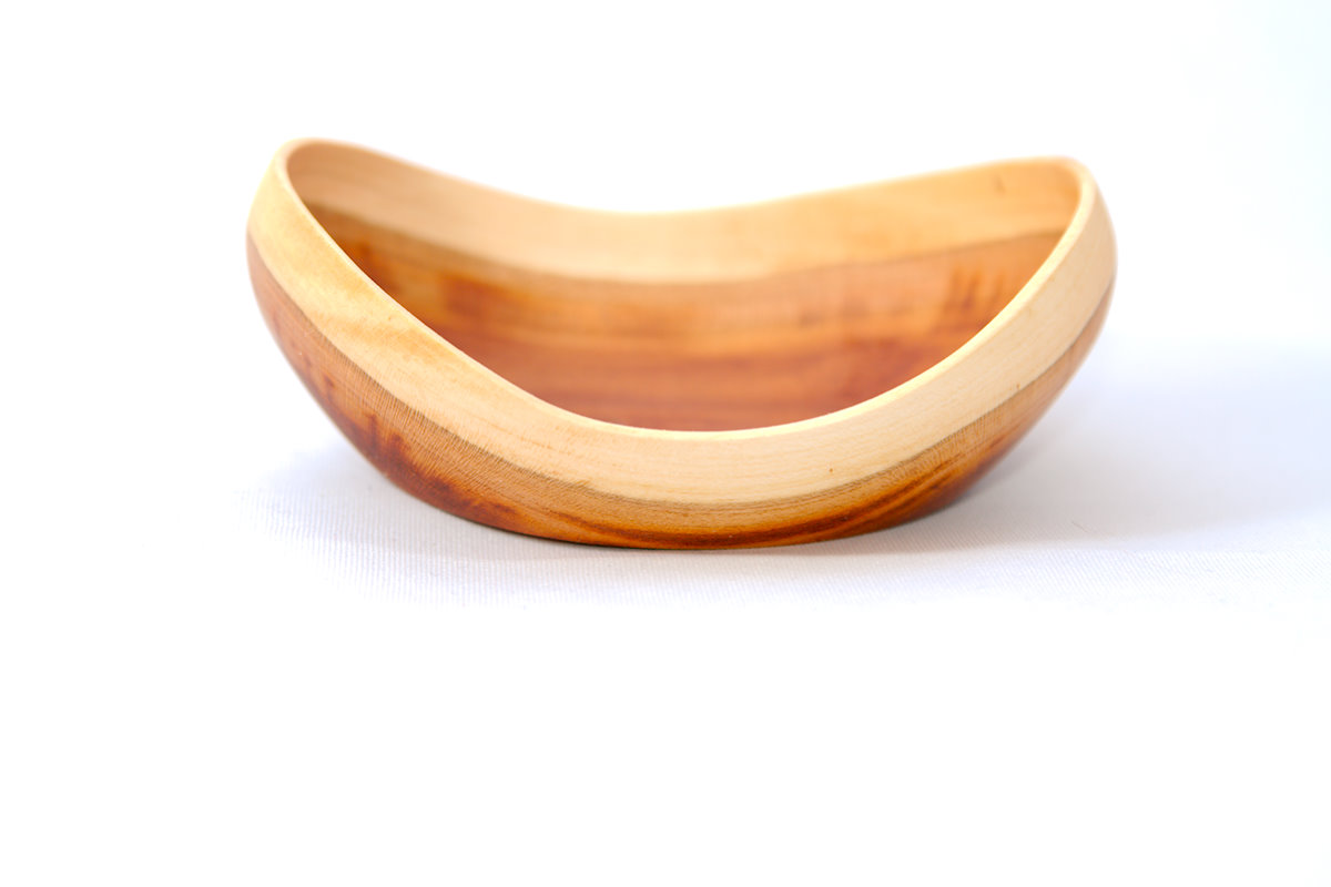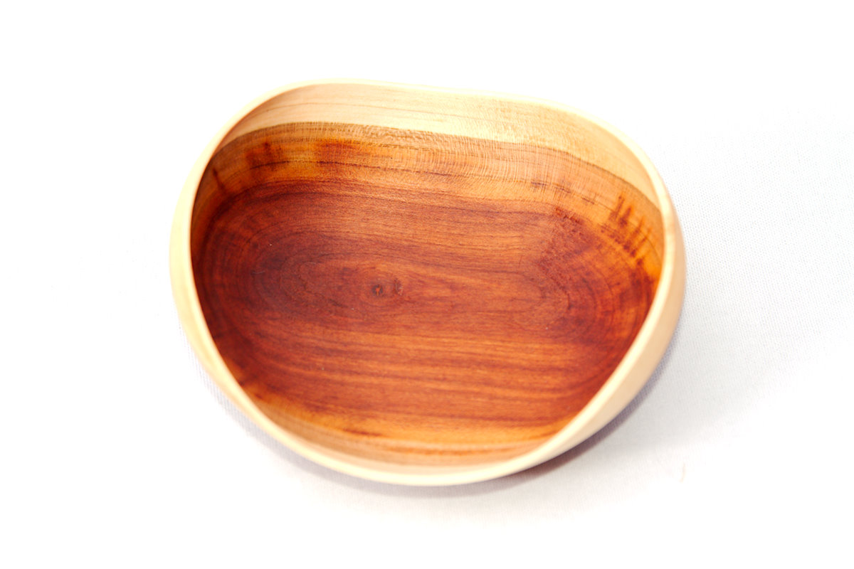 Die Schale ist beim Drechseln rund, wenn man von oben draufguckt, sieht man das auch. Die Form entsteht dadurch, dass die Ränder unterschiedlich hoch sind. Außerdem war das Holz beim Drechseln noch nass, so verzieht es sich beim Trocknen auch etwas und die Form wird leicht oval.