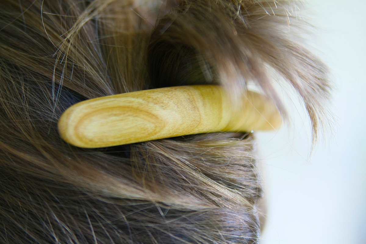 Anbei noch ein Foto meiner letzten Kreation. Eine Haarspange in Kirschholz. Nicht gedrechselt sondern auf der Bandsäge grob herausgeschnitten und auf der Drechselbank an einem Schleifteller in Form gebracht.