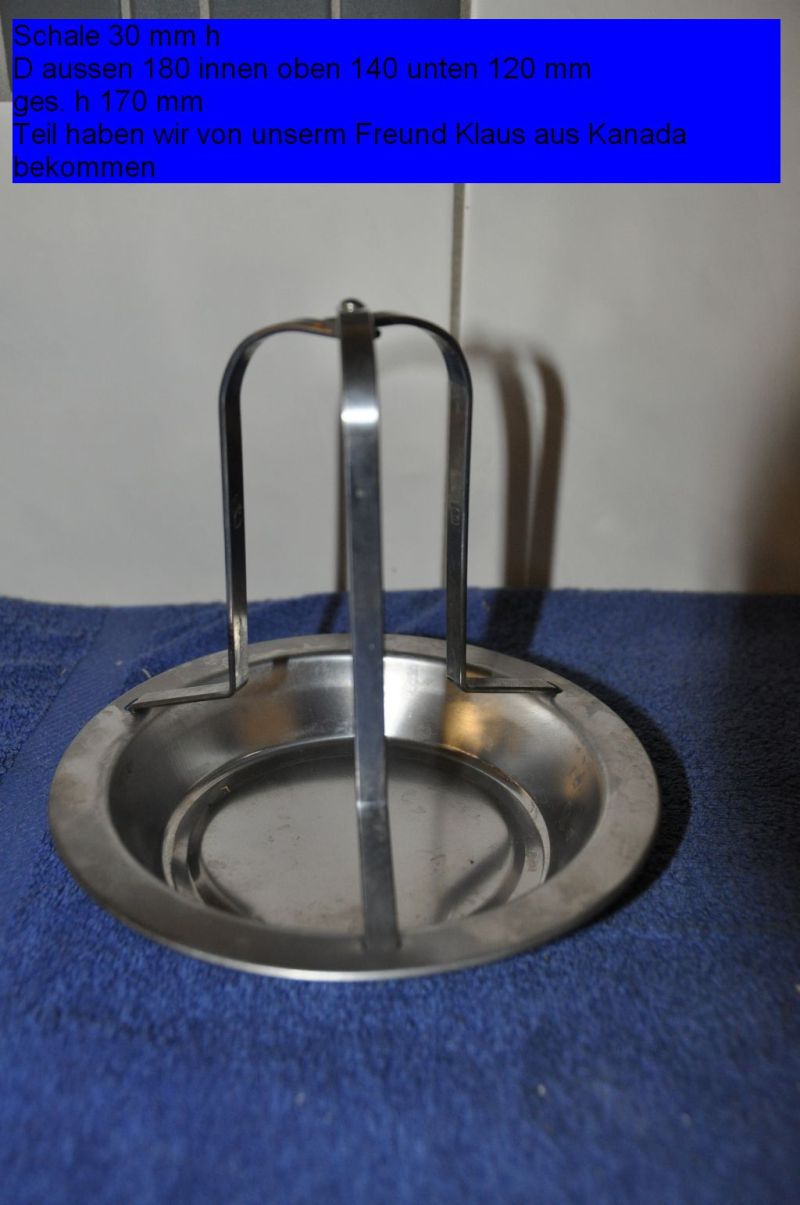 der dreiteilige Hals ist ganz einfach aus Flacheisen Edelstahl und kann aus der Schale herausgenommen werden ,so wie ich das sehe, in der Mitte mit einem Niet oder mit einer Schraube verbunden. Der Radius müsste grösser wie eine Bierdose 0,33 ltr sein, denn genau diese Bierdose sollte beim Braten drinn stehen und dem Gockel einen besseren Geschmack zu geben, denke du hast ja beim Braten und warten auch Durst. Die Schale würde man im Disconter bekommen, das Flacheisen denke ich im Baumarkt. Man könnte aber das Flacheisen unten gerade machen und so mehre Gügeli in einem grossen Bräter in den Ofen stellen .