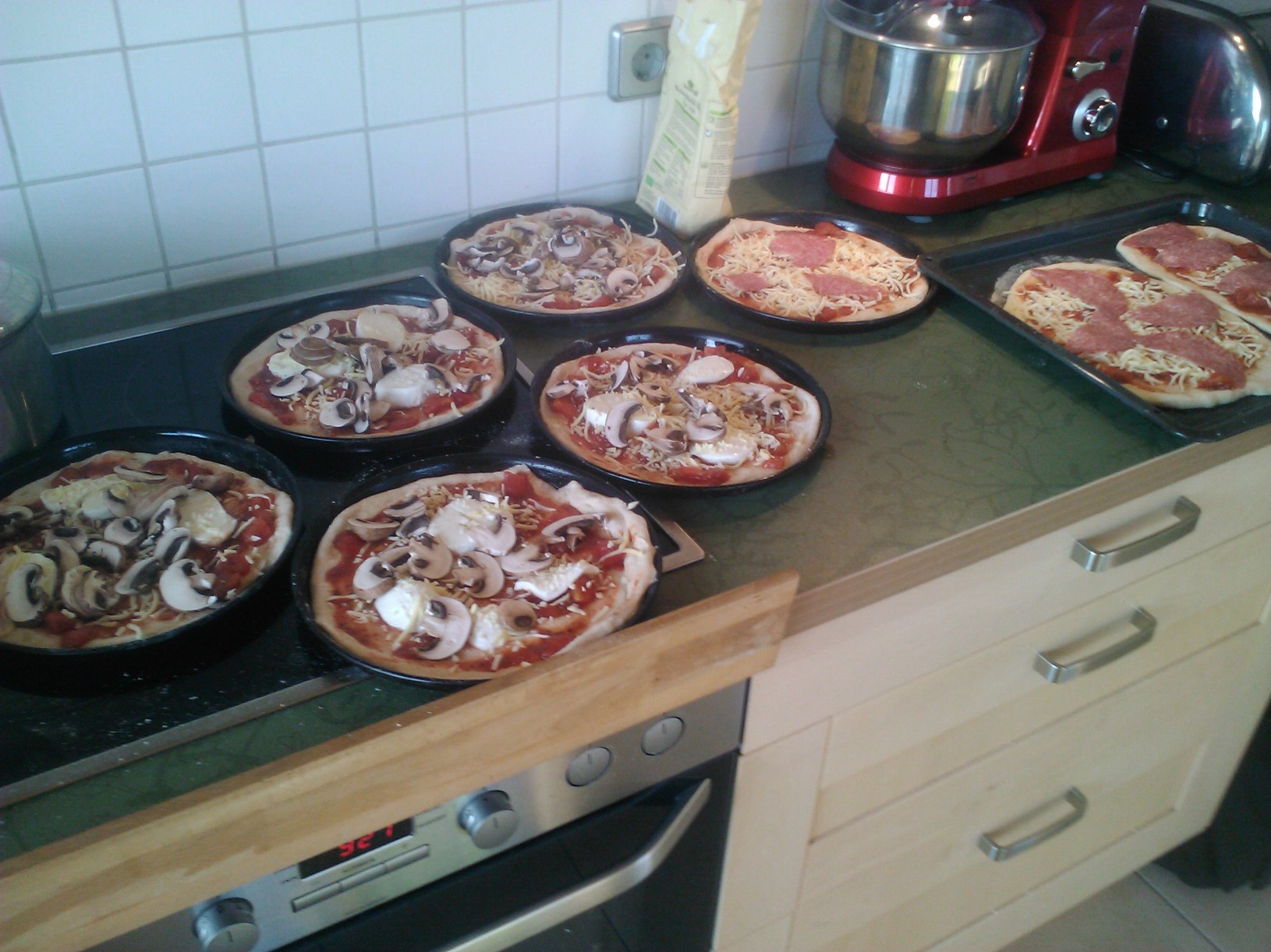Vorgestern hatte ich schon Teig für 8 Pizzen angesetzt und in den Kühli gepackt. Diese habe ich vor dem Brot heute früh gebacken und gleich heute Mittag eingefroren für schlechte Zeiten.
