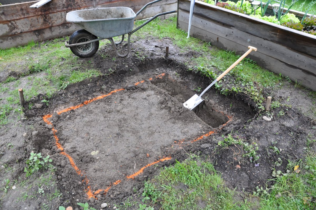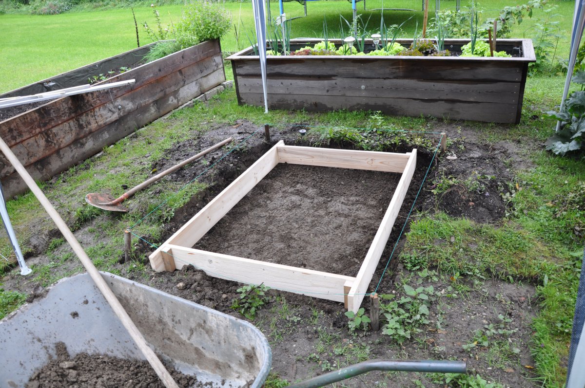 Anbei mal die ersten Bilder. Der HBO soll genau zwischen den Hochbeeten enstehen. Backfläche habe ich zum Abmessen mal ausgelegt. Zwischen Schamottziegeln und Außenziegeln kommten 8 cm Steinwolle als Dämmung. Ergibt eine Grundfläche von 156x117 cm. Die Bodenplatte betoniere ich mit einem 80 cm tiefen.