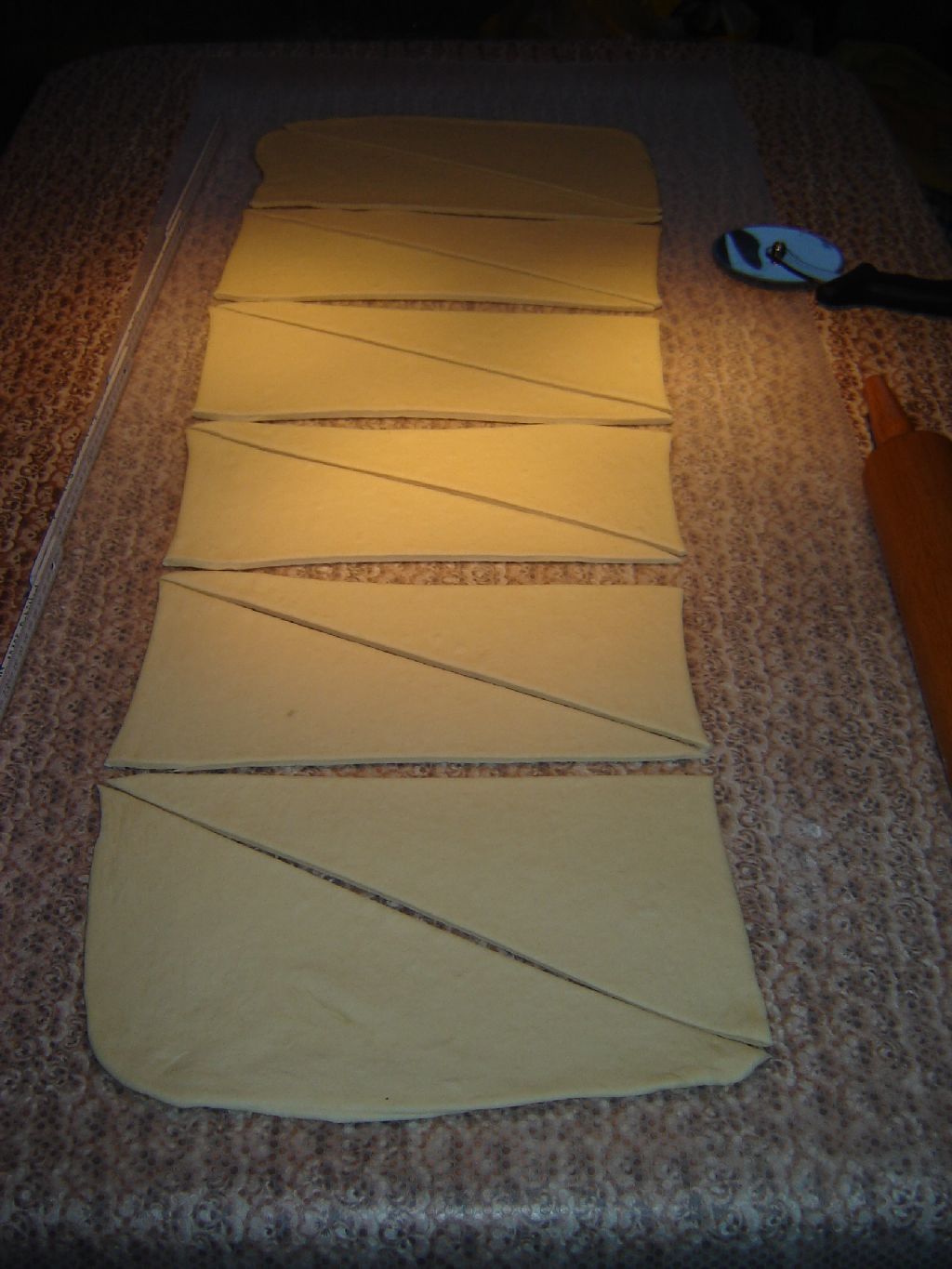 spitzwinkelige Dreiecke ausgeschnitten, aufgerollt, und mit verquirltem Ei bepinselt.