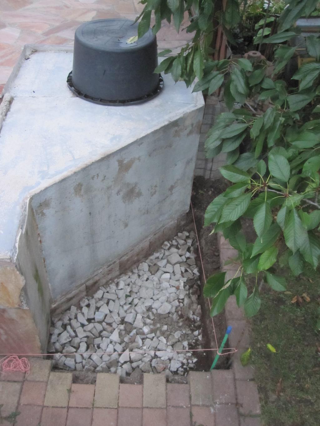 Ein paar gröbere Brocken (der Abfall den ich oben auf der Terrasse unter den Fliesen weggeschlagen habe) für den Unterbau. Darüber habe ich dann noch eine feinere Schicht Schotter verteilt und alles gut gestampft.