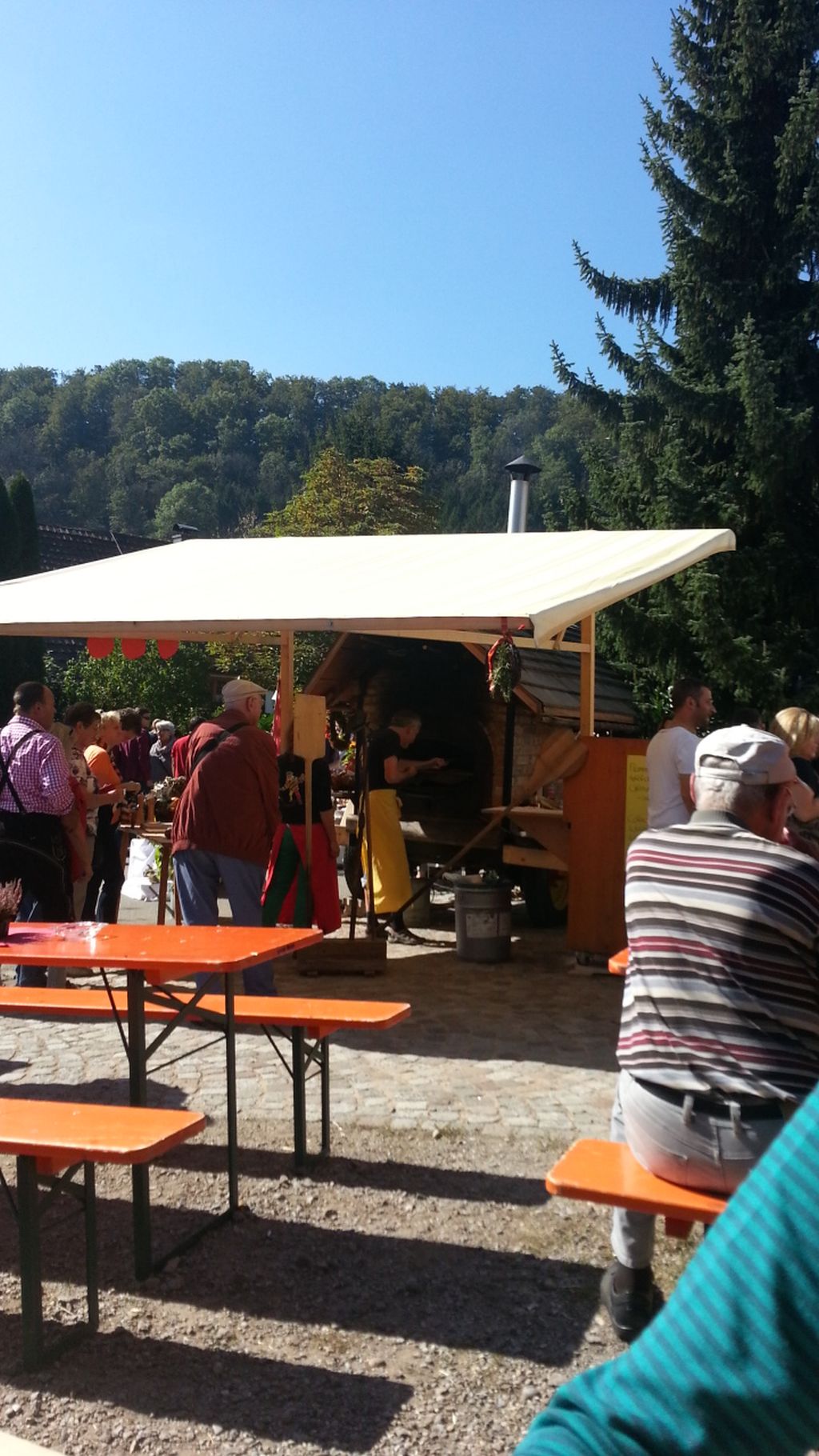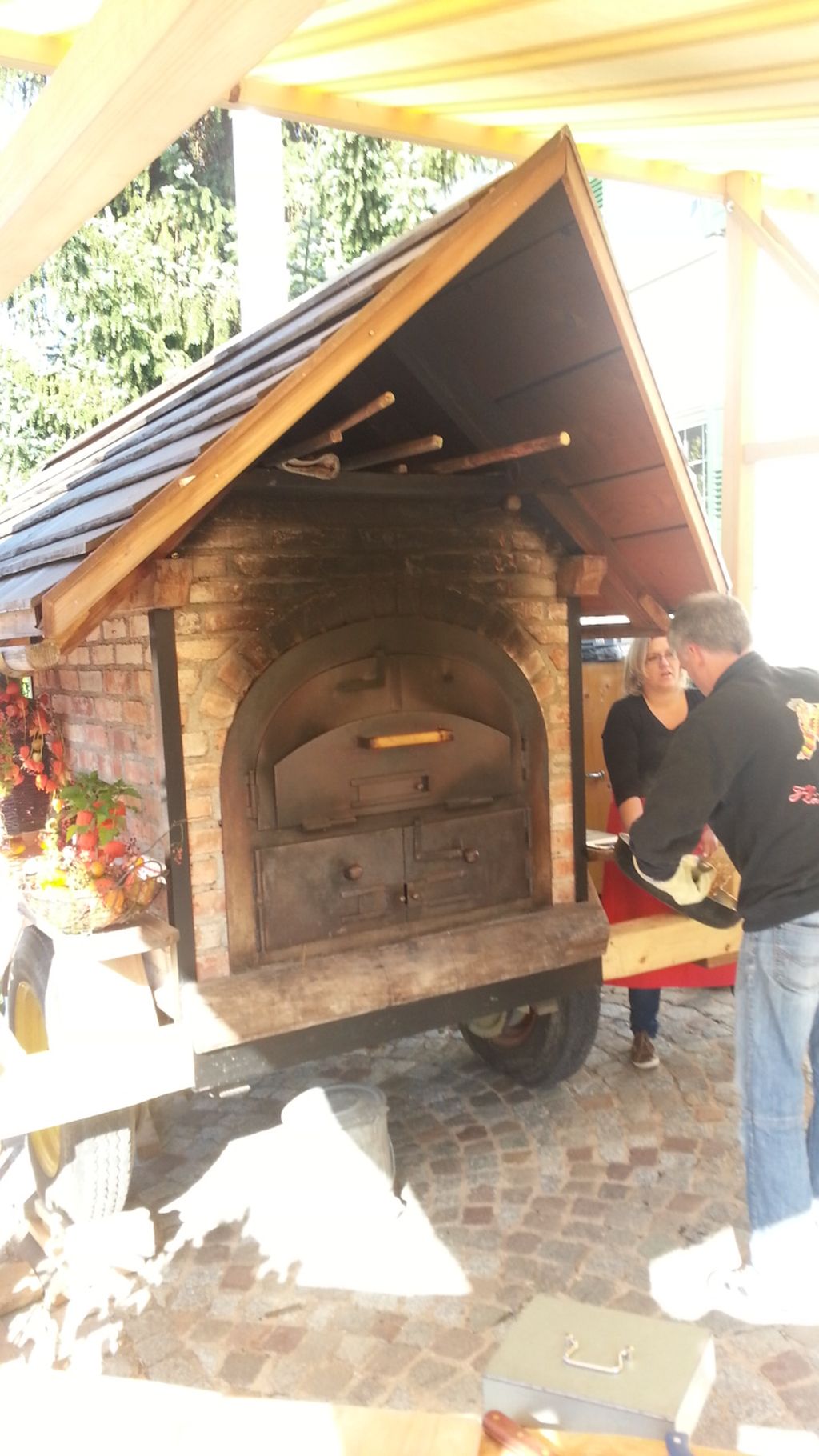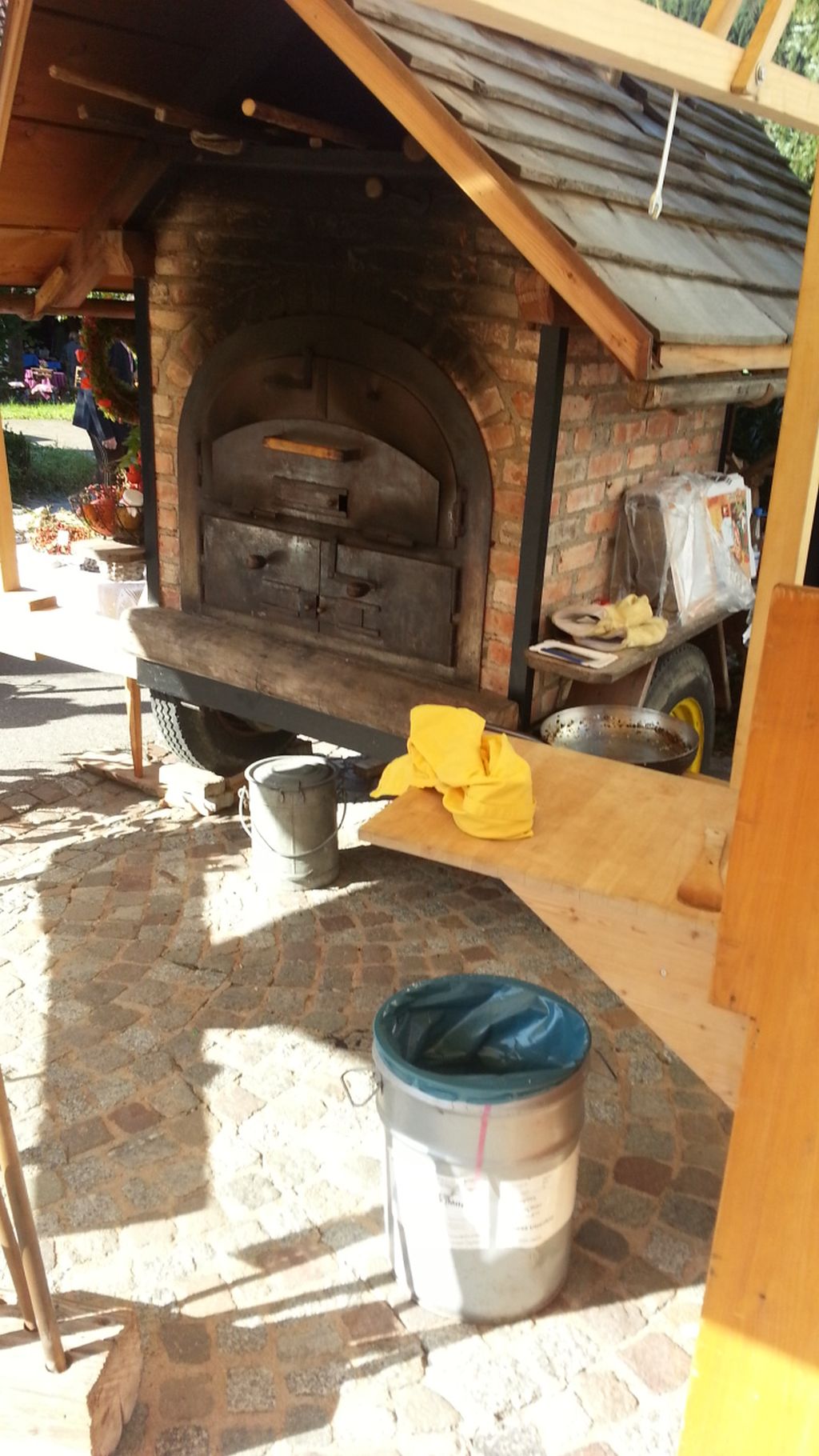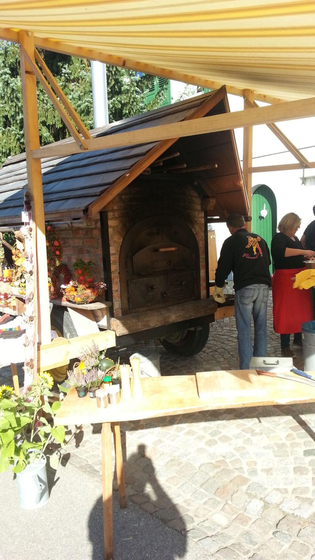 heute habe ich mir mal einen Besuch auf einem Markt gegönnt, anstatt immer am Ofen zu bauen. Hier habt ihr mal ein Paar Bilder und könnt euch die Eindrücke reinziehen. Das war von der Seite, es waren allerleiLandesprodukte gelagert, links vor dem Ofen ist das Feuerholz. Auf der rechten Seite werden die Fladen angerichtet und dahinter ist ein hölzerner Gärschrank, voll mit Teiglingen. Der Wagen auf dem der Backofen steht ist einer aus der Landwirtschaft und wird mit einem Traktor bewegt. Es war ein Markt mit sämtlichen Produkten regional, es wurde sogar Bier gebraut, Schnaps verkauft und alles andere.