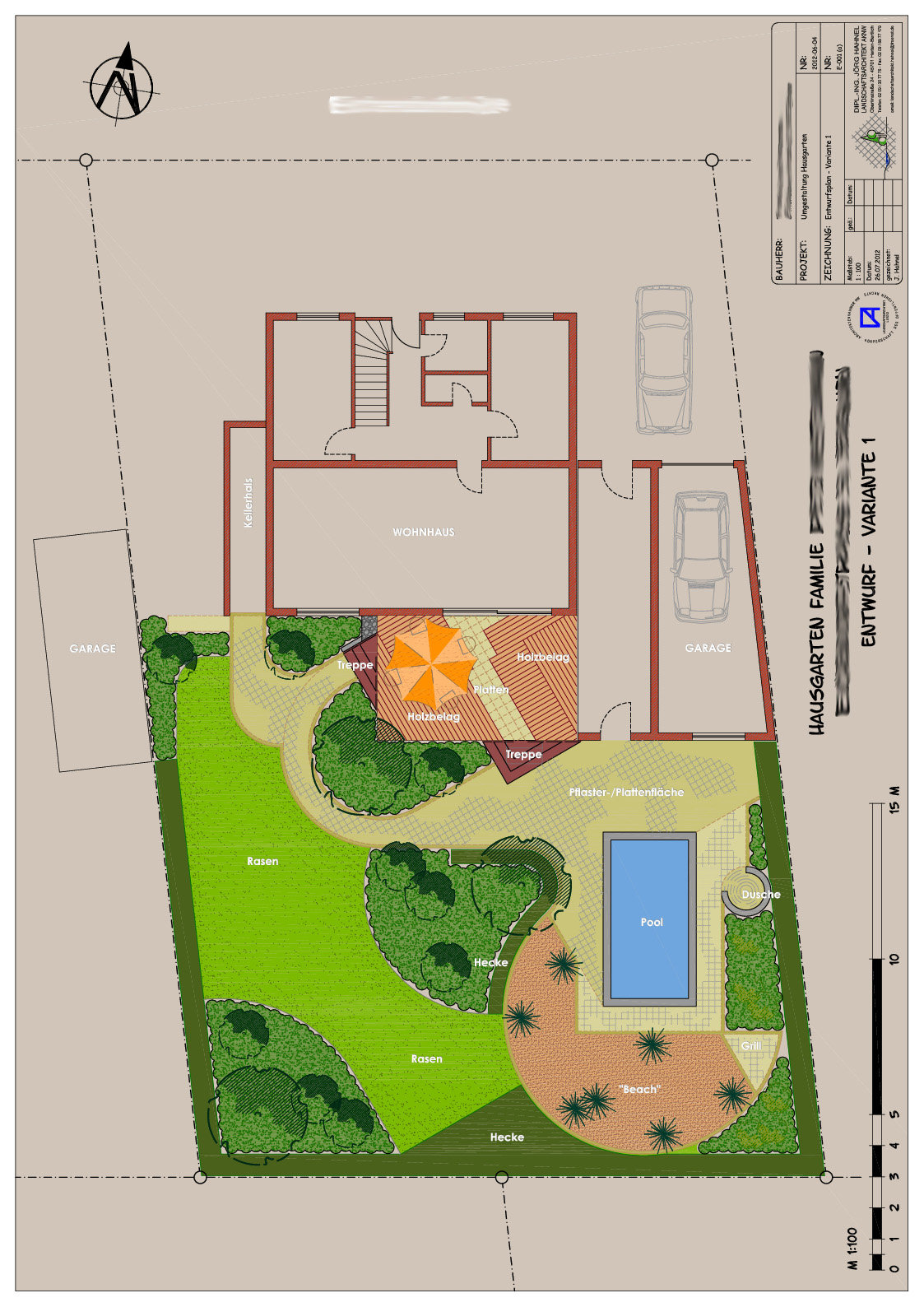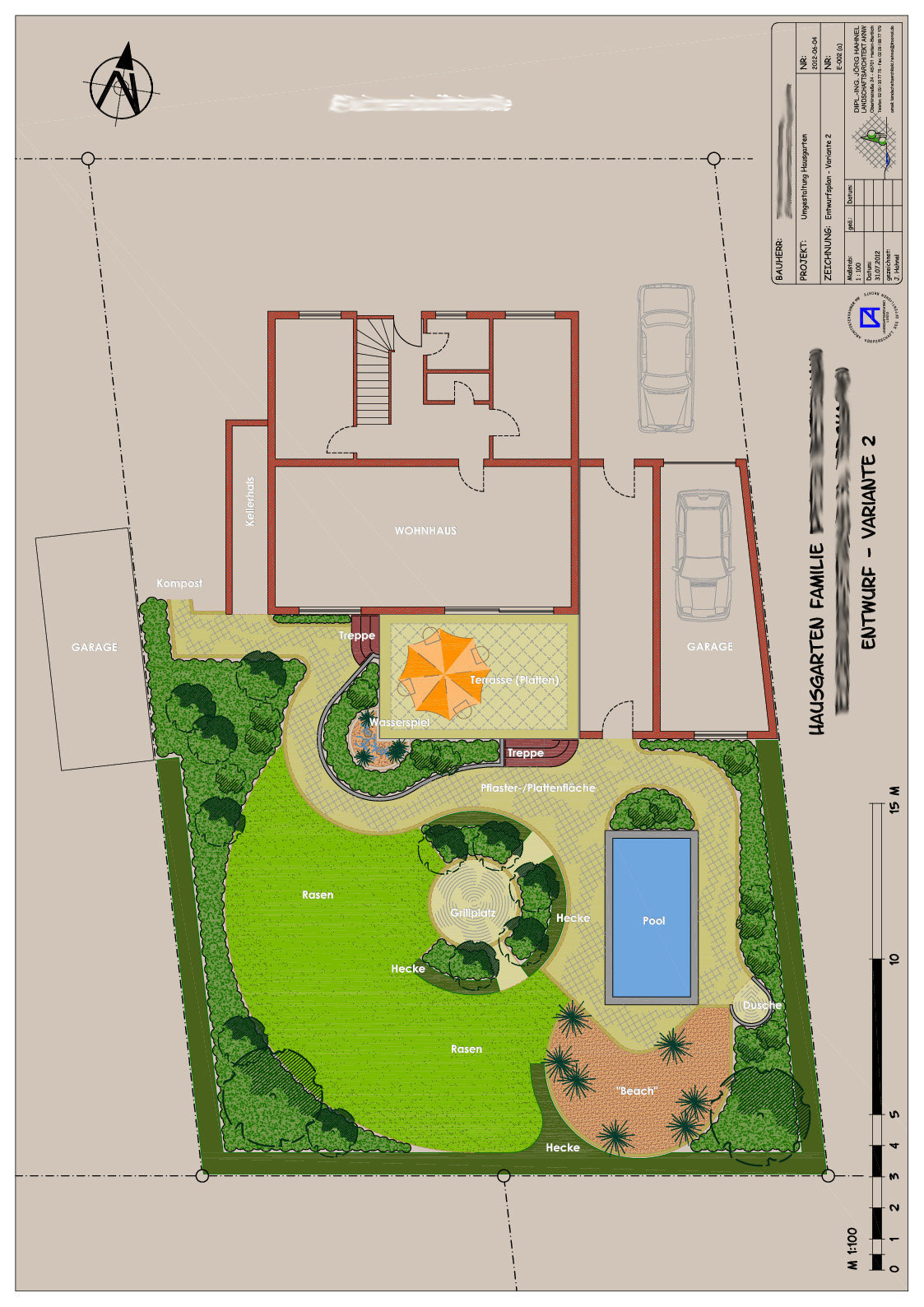 Vorgaben: Terrasse, Pool und umgrenzende Hecke vorhanden.