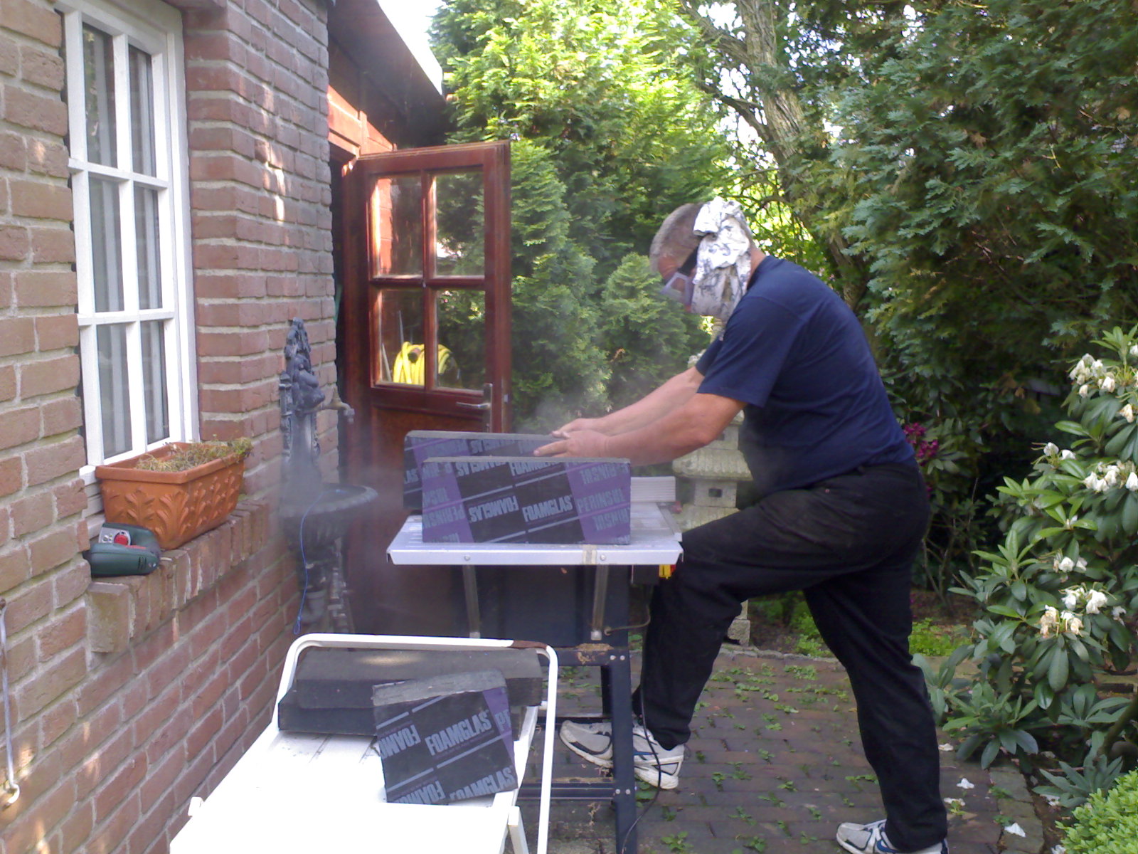Ich rate dringend davon ab, die Foamglasteile mit der schnell laufenden elektrischen Säge zu schneiden. Eine einfache Bügelsäge geht durch wie Butter und macht keinen Staub. Es ist FEINSTSTAUB der entsteht und sich wie Schmirgelpapier auf die Schleimhäute und in den Hals legt. Selbst die Augen sind voll davon, obwohl ich glaubte mich ausreichend geschützt zu haben. Nun sitze ich hier mit Kopfschmerzen und trinke Milch zur Entgiftung (wo ich doch eine Sauvignon Blanc offen habe).