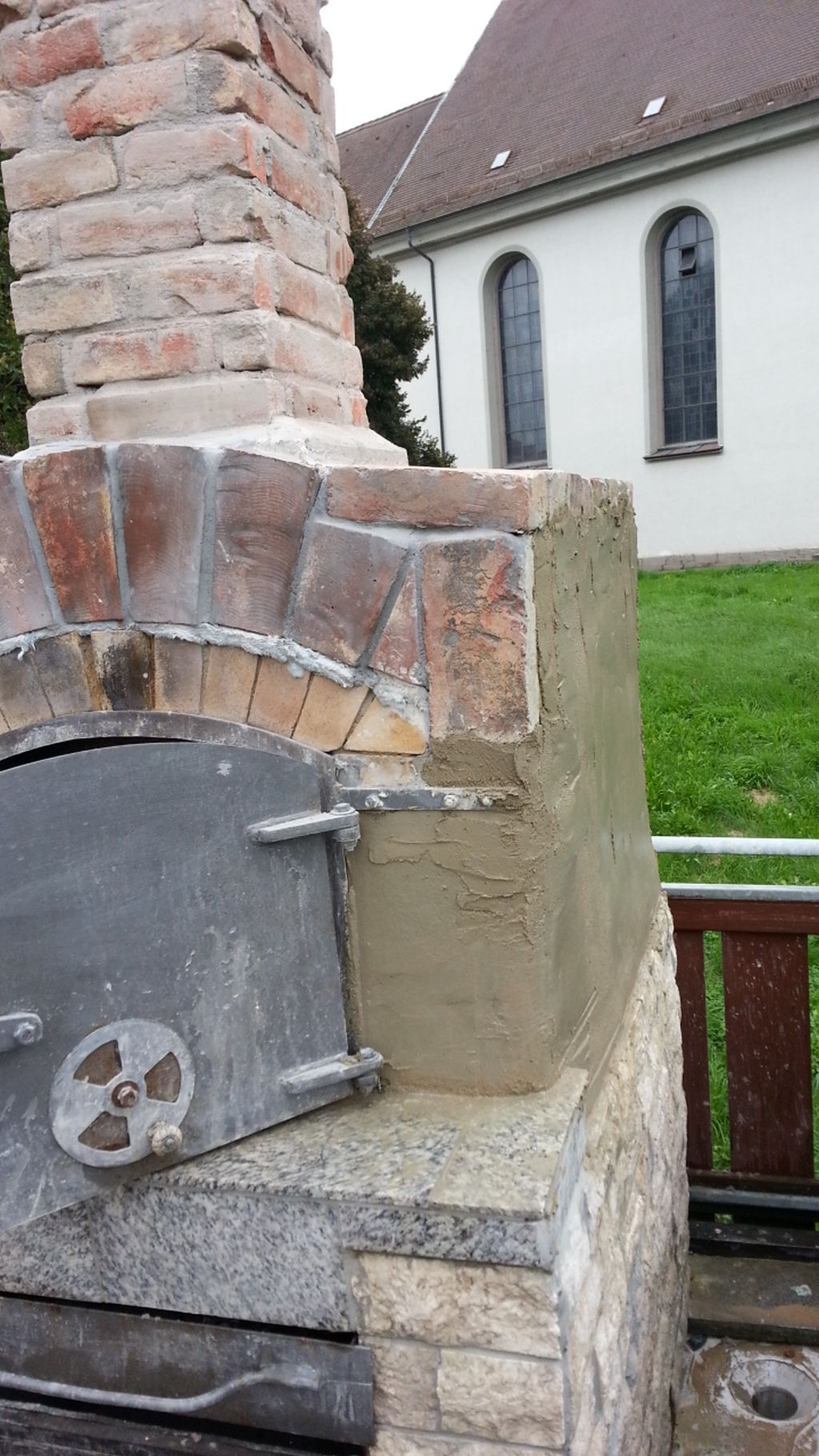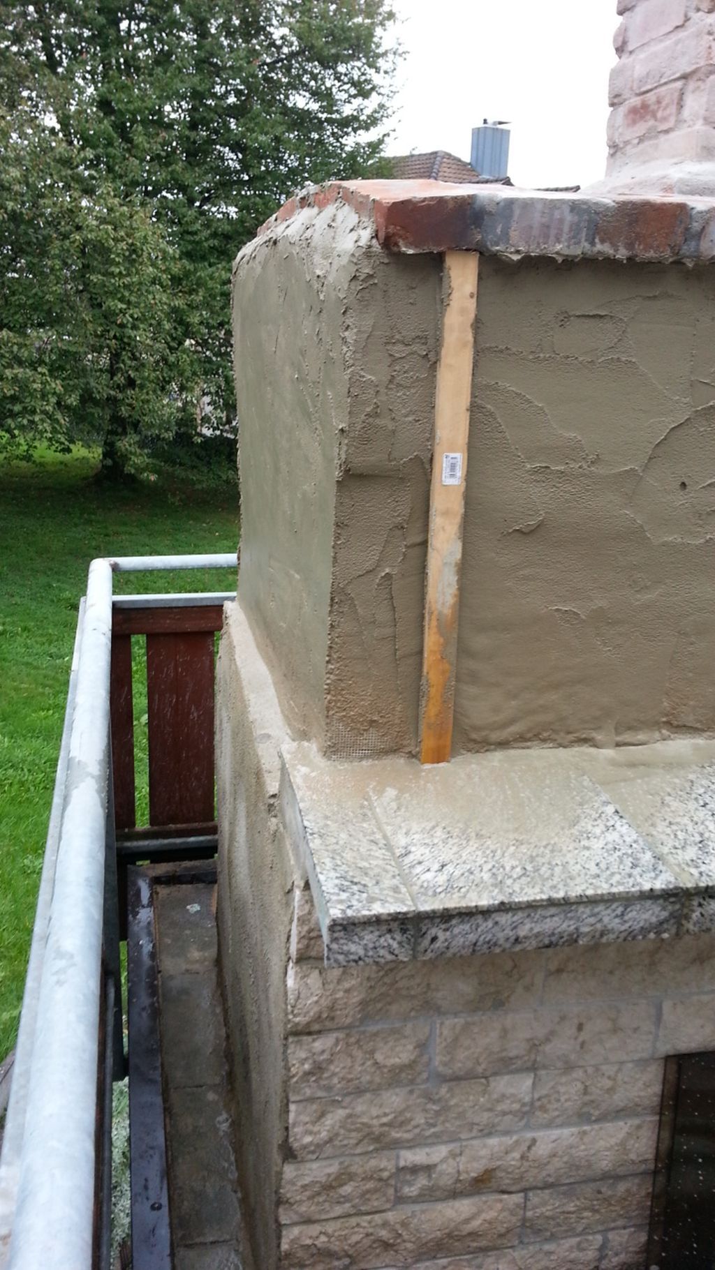 Seite nach Osten. Und Nord West. Beim abreiben wurde ich beobachtet von 2 Gipser gesellen die an der Kirche was zu tun hatten. Sie meinten das wäre gute Arbeit , ich könnte sie gerade vertreten und bei ihnen anfangen. Ich bin mit der Arbeit zufrieden und bin gespannt wie sich der Putz verhält wenn der Ofen warm ist , aber der Sockel am Haus wird ja auch sehr Warm und außerdem mache ich mir da keine Gedanken , an den alten Öfen waren auch Risse im Putz das gehört dazu. Später wird noch eine Außenwandfarbe darauf gestrichen und dann sehen wir weiter.
