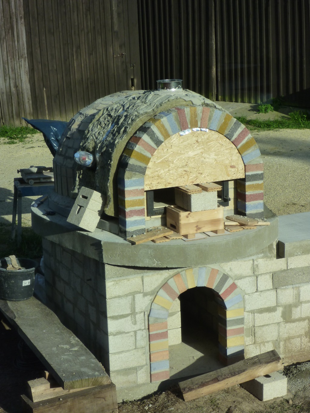 Bin schon ein bisschen stolz, dass das Ding nun endlich zu ist...nun stehen Grabkerzen zum Trockenen drin...morgen fange ich mit der Außendämmung an und hoffe, dass ich den vorderen Bogen fertig bekomme.