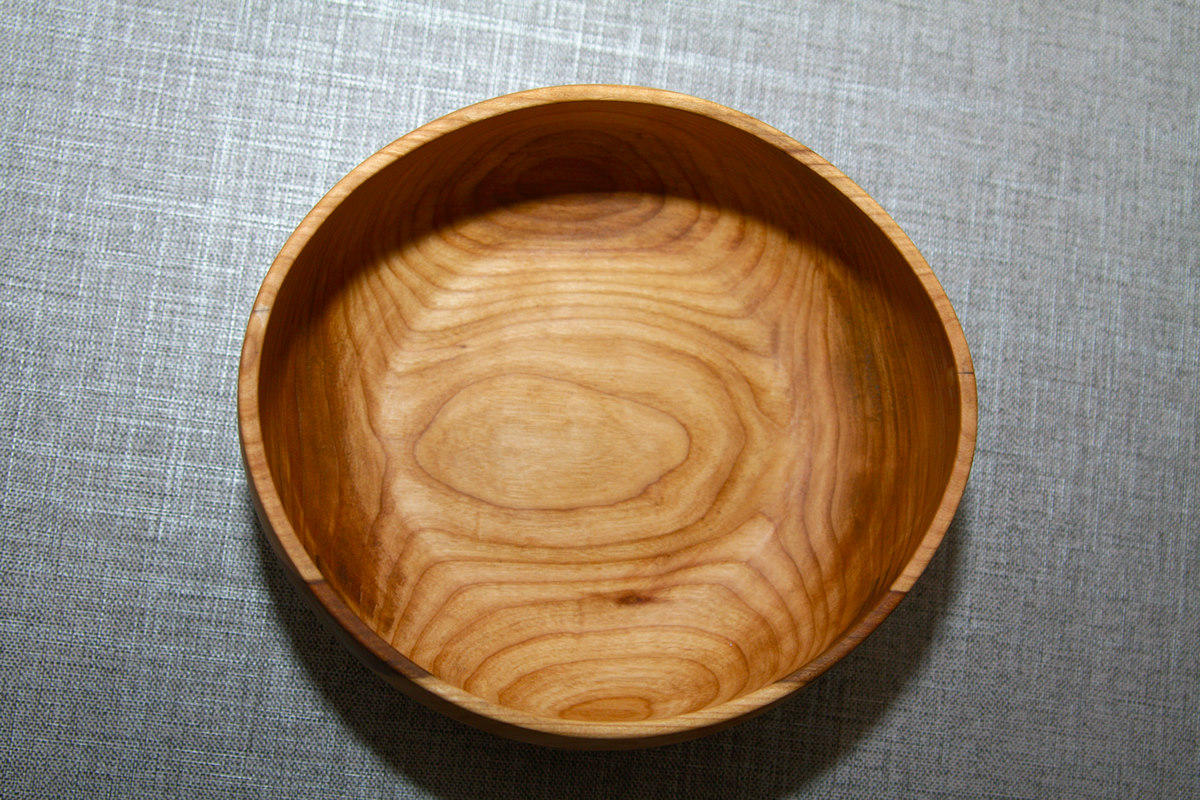 Die Schale ist trocken. Wie üblich hat sich das nasse Kirschholz beim Trocknen verzogen und ist leicht gerissen. An ein paar Stellen muss ich noch etwas nachschleifen. Ansonsten ist das Objekt fertig. Das Oberflächenfinish erfolgte mit einer Mischung aus Lein- und Orangenöl.