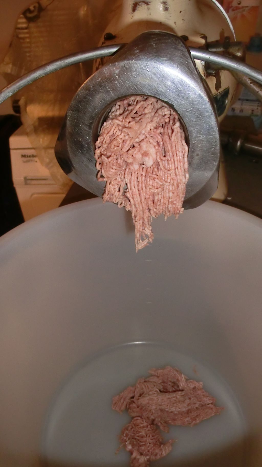 Das Fleisch zwei - drei Stunden in der Kühltruhe anfrieren lassen. Anschließend durch die 3mm- Scheibe des Fleischwolfes drehen. Pökelsalz, Traubenzucker und Gewürze dazugeben und fünf Minuten gut durcharbeiten. Die Senfkörner werden erst nach dem Wolfen eingearbeitet.