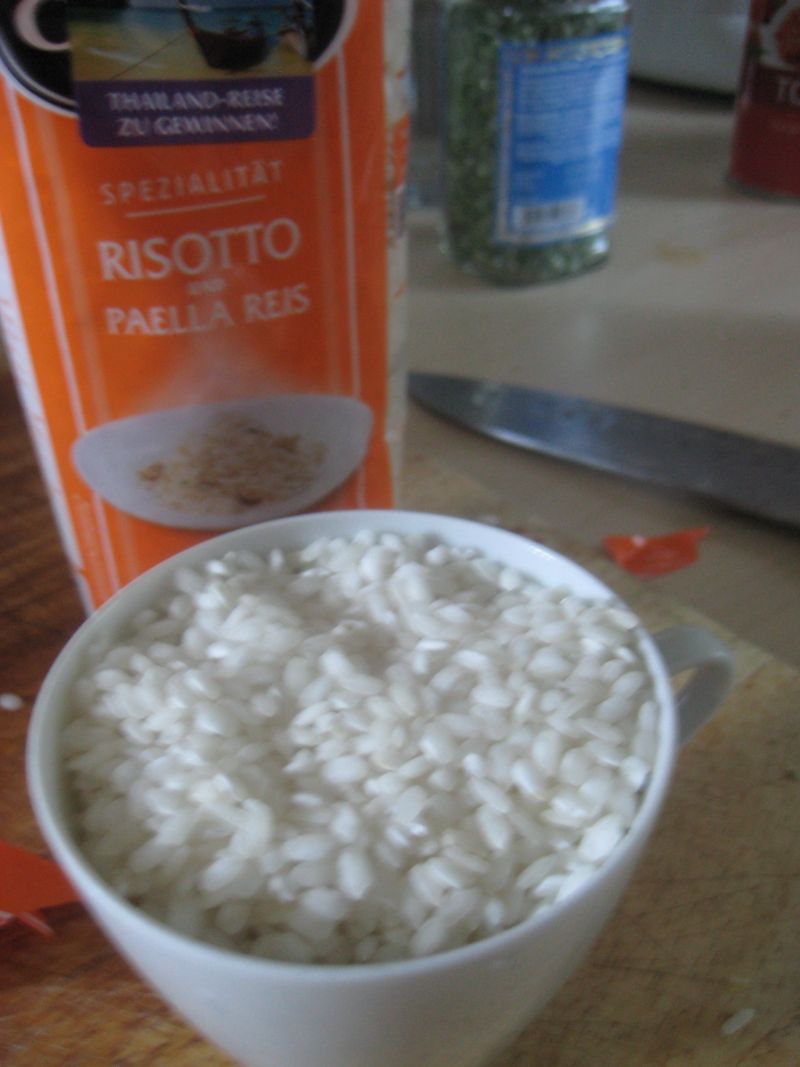 Zwei Tassen Rundkornreis dazu und mit dem Hühnerfond, dem ich noch etwas Fischfond und Safran zugegeben habe, aufgefüllt geht’s unter die Haube.