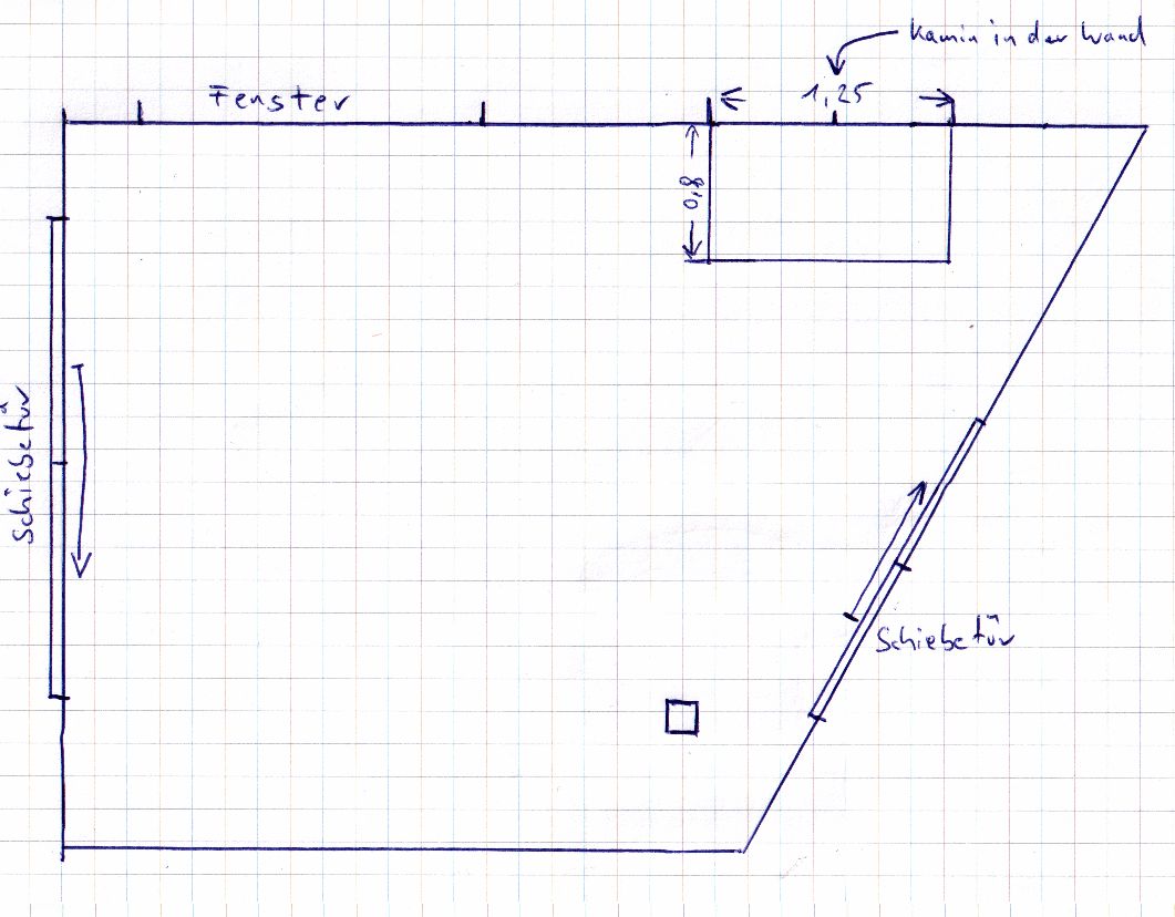 Hier mal die Skizzen. Oben der Raum (Wintergarten) mit dem Fundament in der Größe des alten Ofens. Unten ein erster Entwurf.