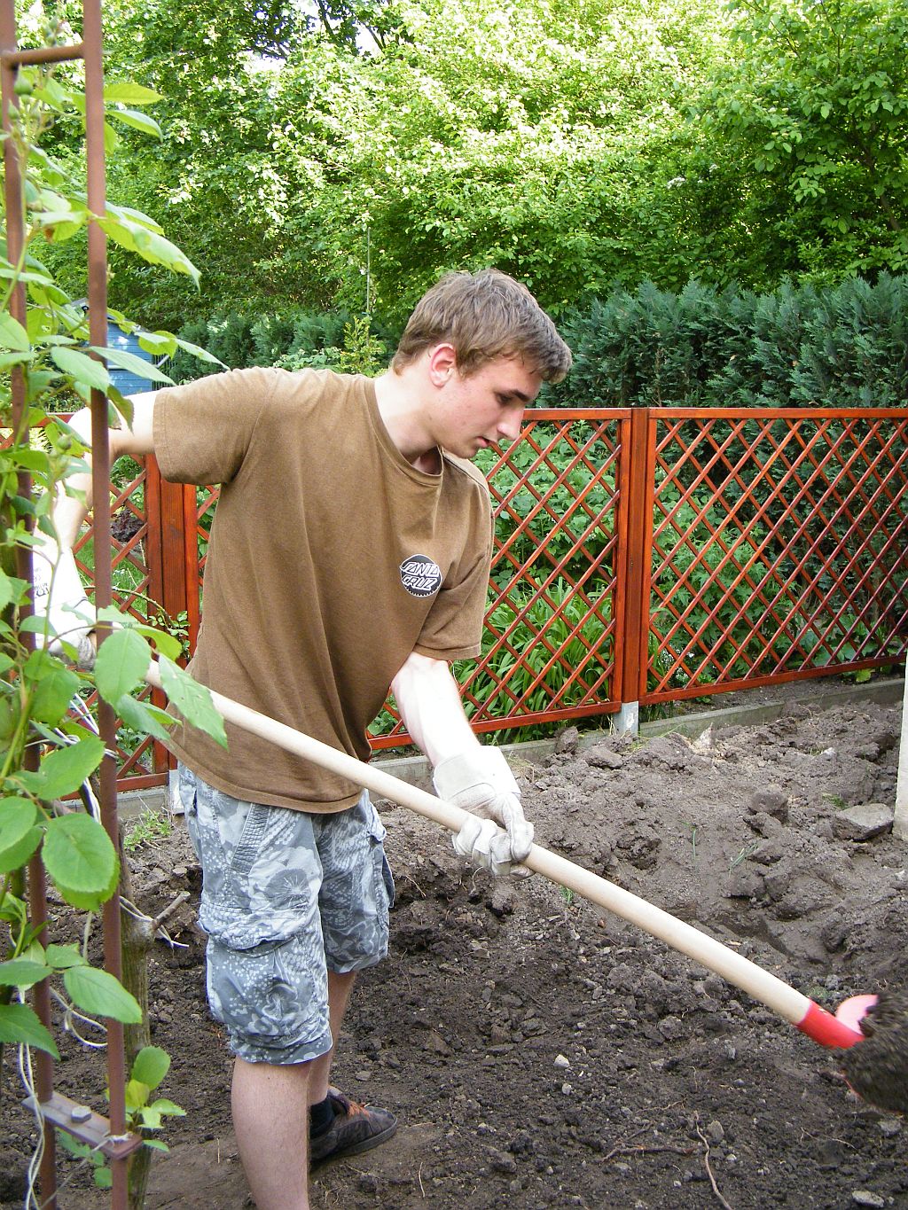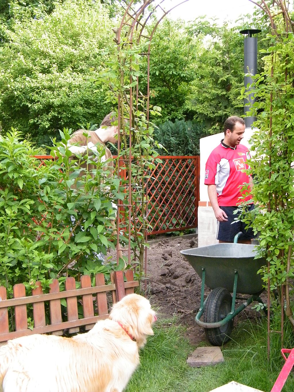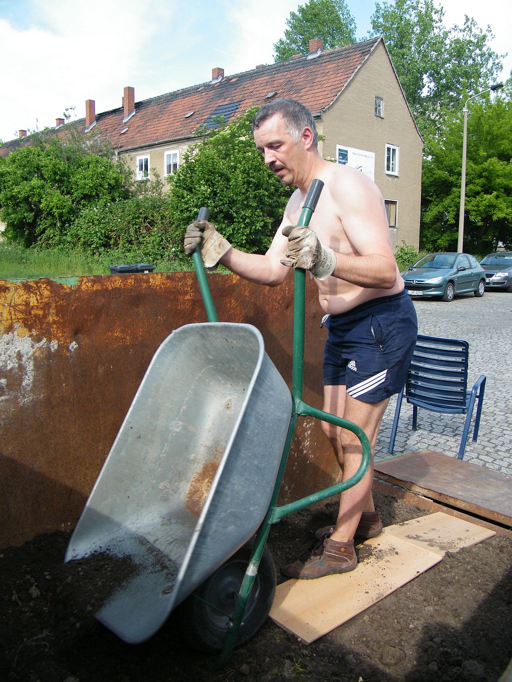 Es galt also, etwa 3m³ Erde auszuheben, alles manuell, und vors Haus in einen Container zu bringen. Stiefsohn und Schwiegersohn halfen dabei, Tochter sparte nicht an Kommentaren, und Göfreu hielt alles im Bild fest. Ach so, eine Wurzel wollte auch gerodet werden... Da hatte ich es eigentlich das erste Mal "dicke"...